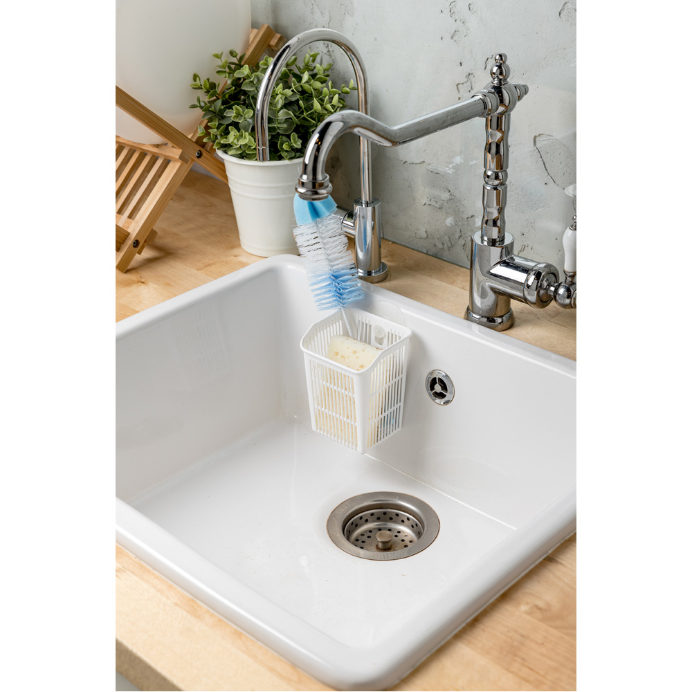Маленький сетчатый держатель-стаканчик для губки, высокой щётки или небольшого средства для мытья посуды крепится к поверхности раковины или глянцевому фартуку с помощью присоса или самореза. Держатель позволяет освободить плоскость возле раковины на кухне и сэкономить место. Хранение губки в держателе позволяет лишней жидкости стекать прямо в раковину и уберегает поверхность столешницы от избыточной влажности, а сетчатый корпус держателя обеспечивает быстрое просыхание губки или щётки и предотвращает развитие на ней грибка. Держатель продаётся в стильной упаковке, в комплекте идёт присос. Легко моется, в том числе в посудомоечной машине (без присоса). Изготовлен из полипропилена, не содержит бисфенол А.