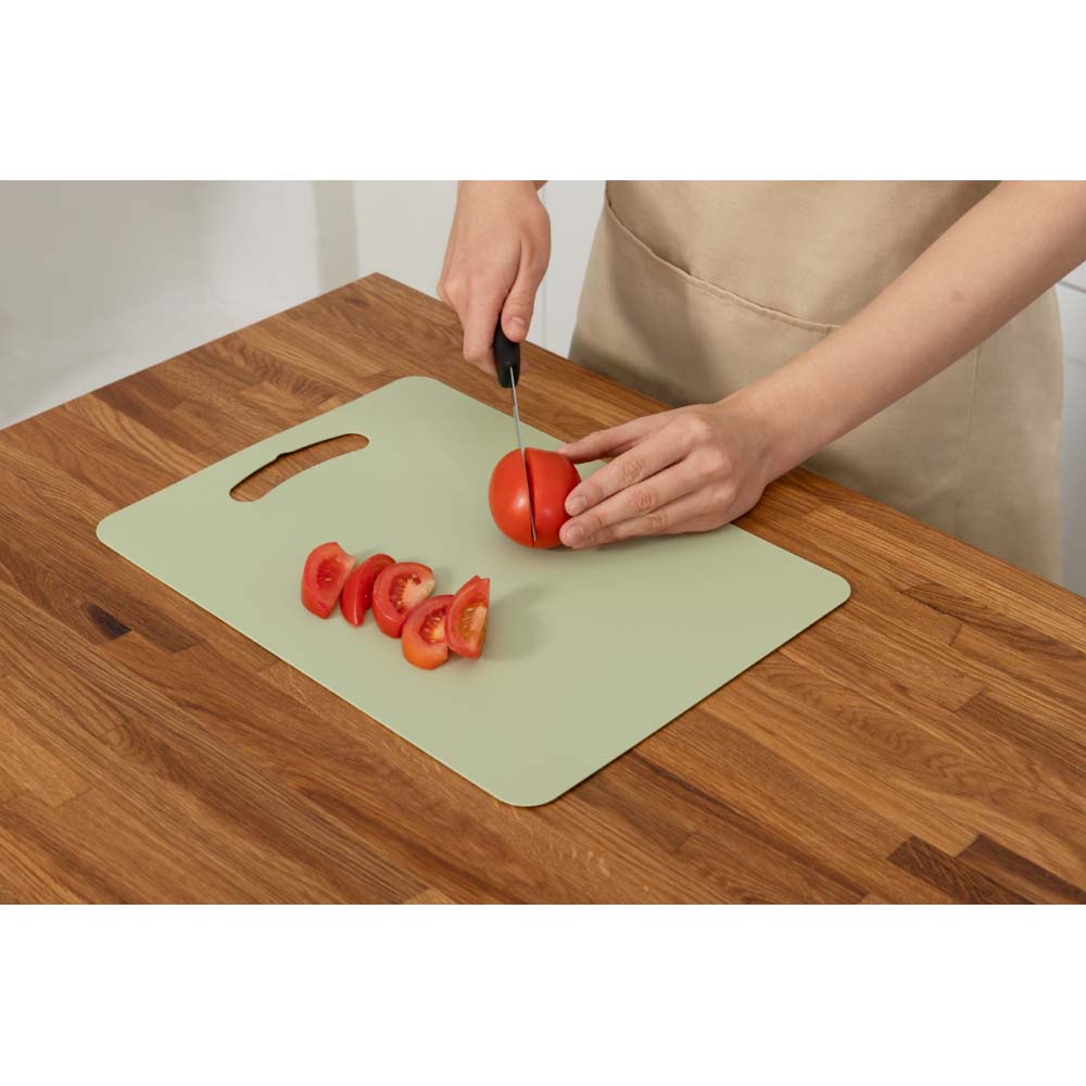 Разделочная доска лёгкая, удобная и станет удачным приобретением для любой кухни. Матовая поверхность не даёт скользить доске и нарезаемым продуктам. Обе стороны являются рабочими, что продлевает срок службы изделия. Доски прекрасно сочетаются, а также комфортны в хранении: удобный вырез позволяет вешать на все типы крючков. Гибкость доски позволяет с лёгкостью ссыпать нарезанное в миску. Малый вес и компактность делают доску отличным выбором для любой хозяйки. Доска формата А4 идеально подойдёт для обычного использования. Доска легко моется, изготовлена из безопасного материала.