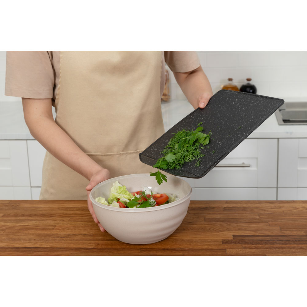 Специальный приподнятый край с маленькими бортиками делает добавление нарезанных ингредиентов в готовящееся блюдо аккуратным и удобным. Также этот край можно использовать как ручку.