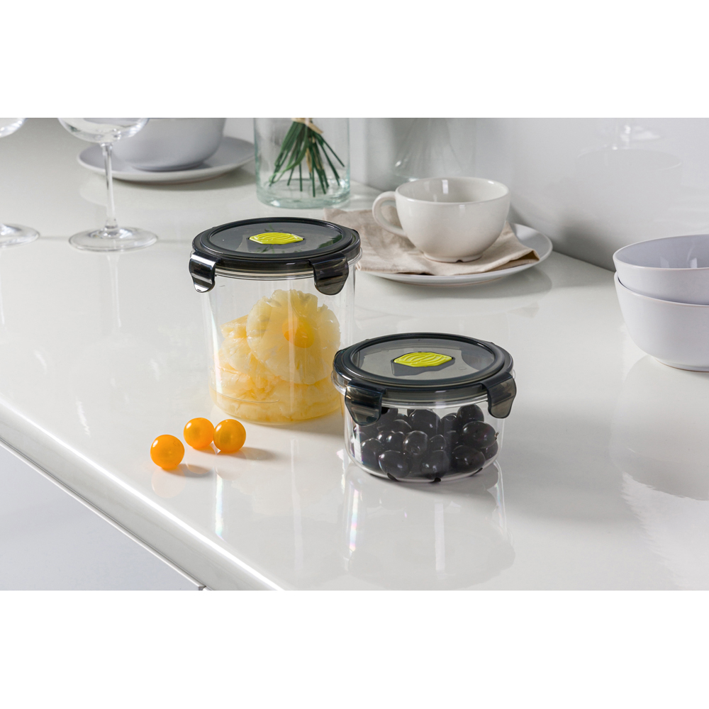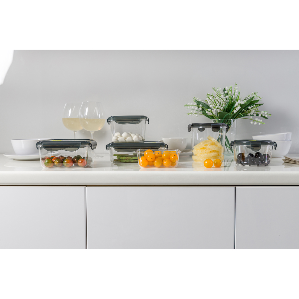 Уплотнители из пищевого силикона в крышке и клапане обеспечивают герметичность контейнера, при этом съёмный уплотнитель легко вытащить и промыть. Контейнеры удобно ставятся друг на друга и экономят пространство на кухне. Не содержат бисфенол А и фталаты.