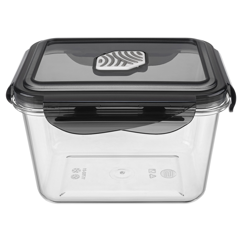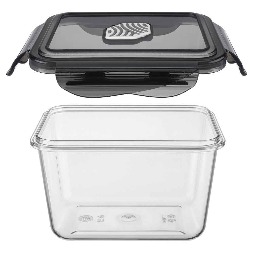Уплотнители из пищевого силикона в крышке и клапане обеспечивают герметичность контейнера, при этом съёмный уплотнитель легко вытащить и промыть. Контейнеры удобно ставятся друг на друга и экономят пространство на кухне. Не содержат бисфенол А и фталаты.