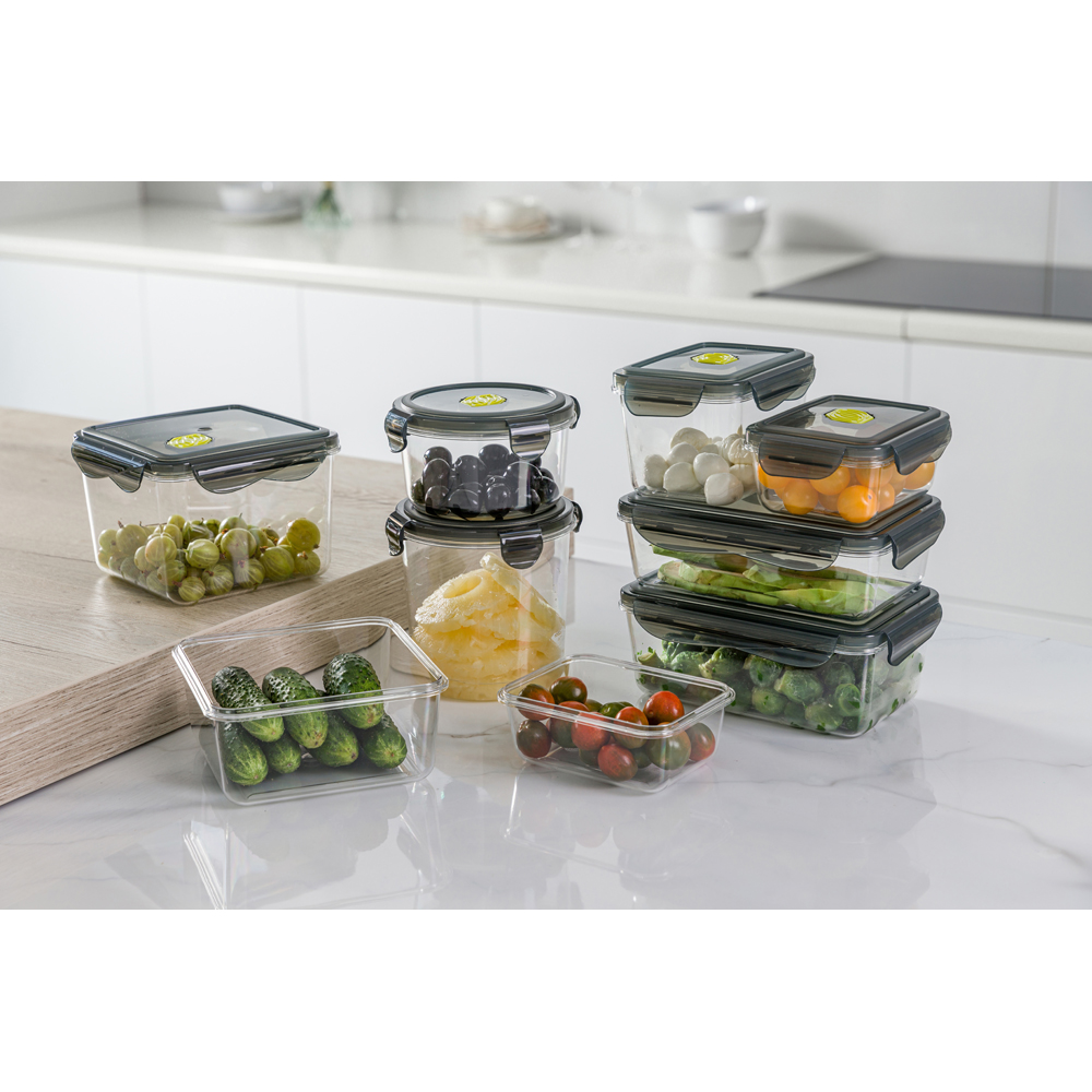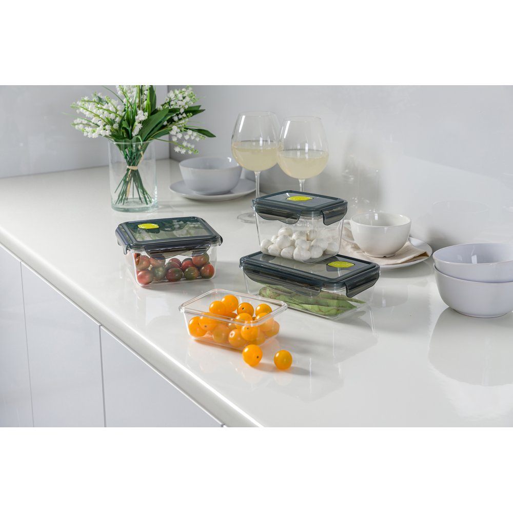 Уплотнители из пищевого силикона в крышке и клапане обеспечивают герметичность контейнера, при этом съёмный уплотнитель легко вытащить и промыть. Контейнеры удобно ставятся друг на друга и экономят пространство на кухне. Не содержат бисфенол А и фталаты.