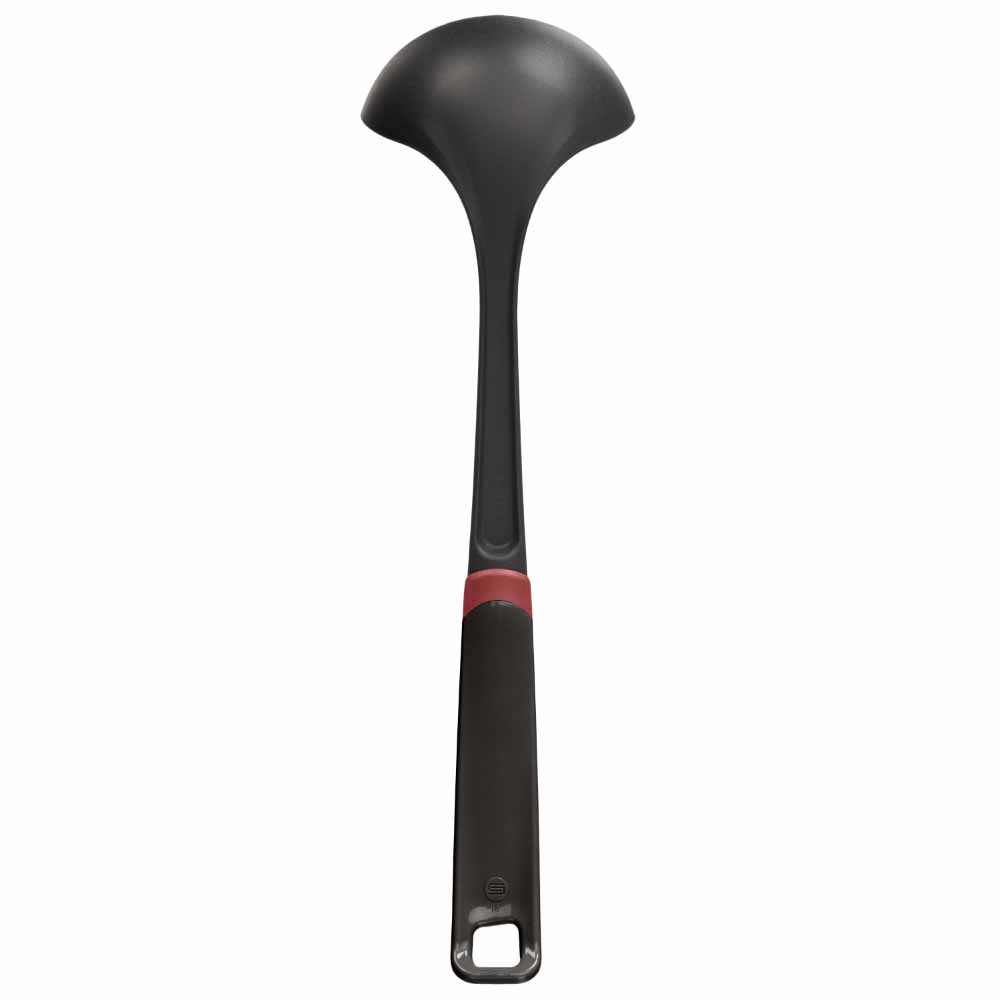 Эргономичная ручка, благодаря вставки из эластомера и матовой поверхности, не скользит в руке и приятна тактильно. Гибкая петля в верхней части позволяет хранить половник в подвешенном состоянии.