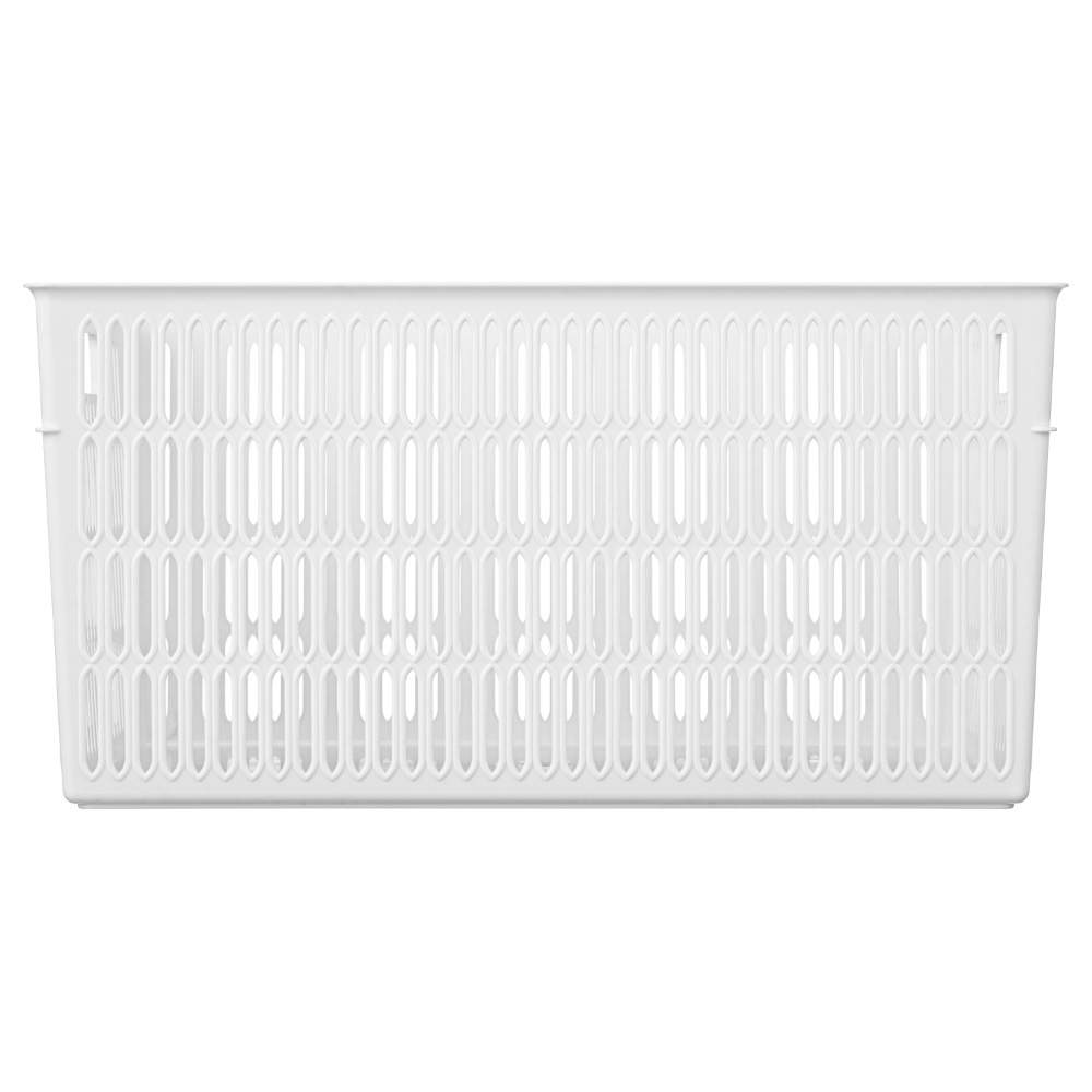 Благодаря боковым ручкам корзинки удобно переносить или снимать с полки. Перфорированные стенки корзинки создают дополнительную вентиляцию содержимого.