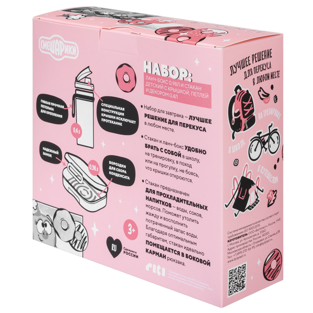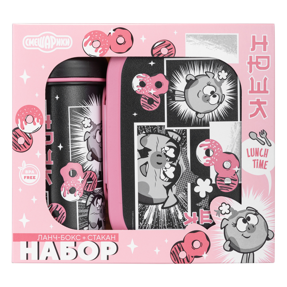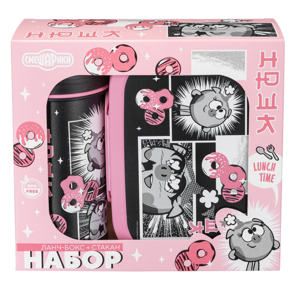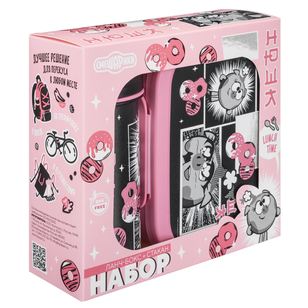 НАБОР: ЛАНЧ-БОКС 0,98Л И СТАКАН ДЕТСКИЙ С КРЫШКОЙ, ПЕТЛЕЙ И ДЕКОРОМ "СМЕШАРИКИ" 0,4Л (Розовый)