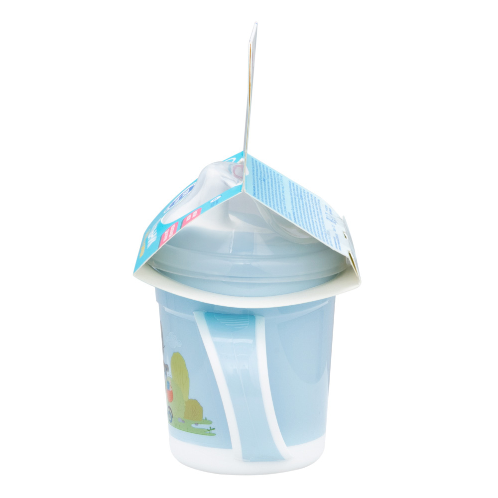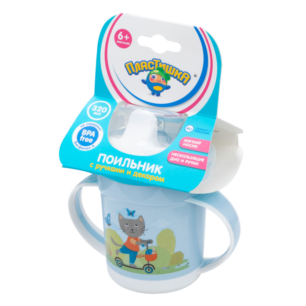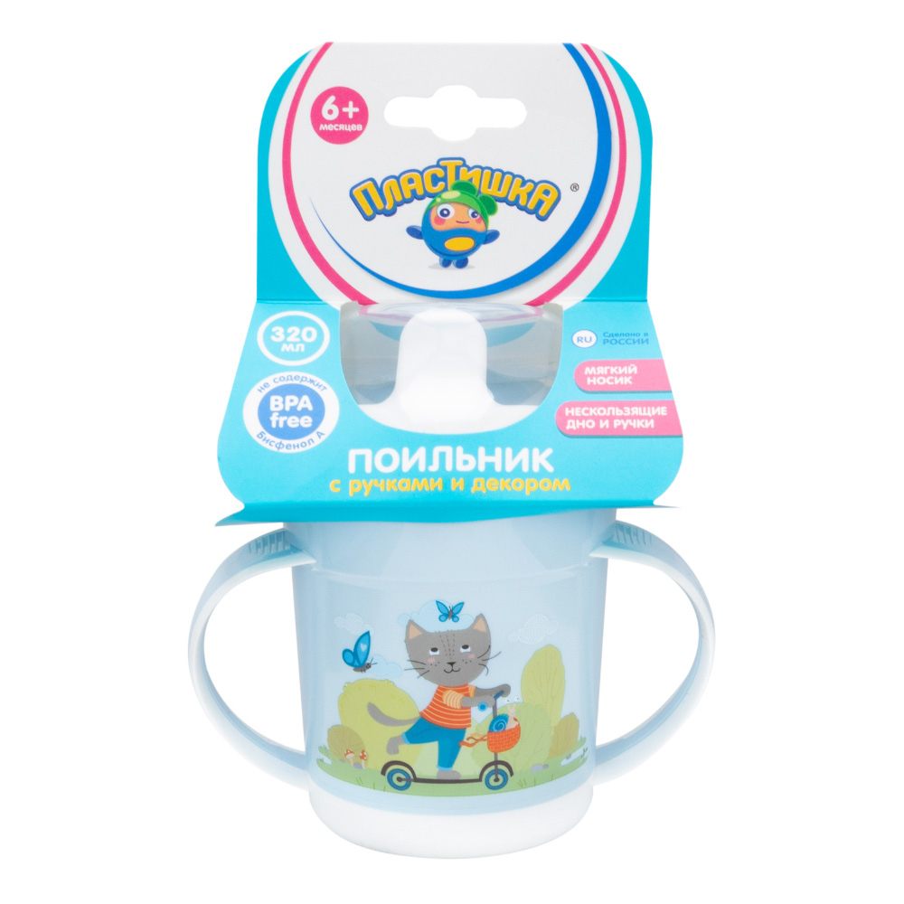 Поильник с ручками и декором «Пластишка» объемом 320 мл поможет научить ребенка самостоятельно пить из чашки.