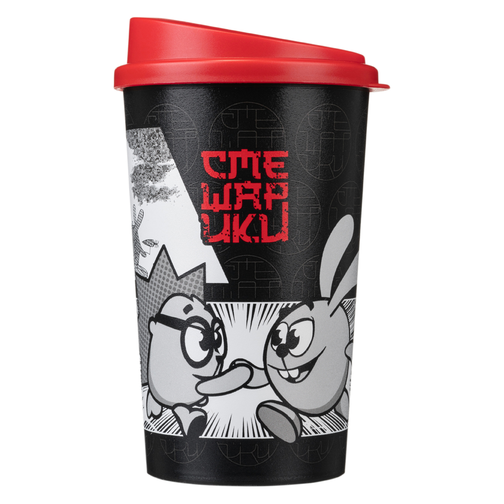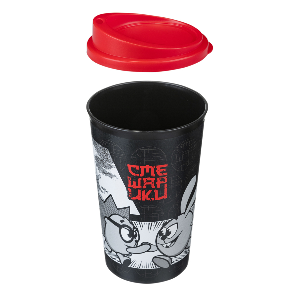 СТАКАН ДЛЯ ГОРЯЧИХ И ХОЛОДНЫХ НАПИТКОВ С КРЫШКОЙ И ДЕКОРОМ "СМЕШАРИКИ" 400МЛ (Черный)