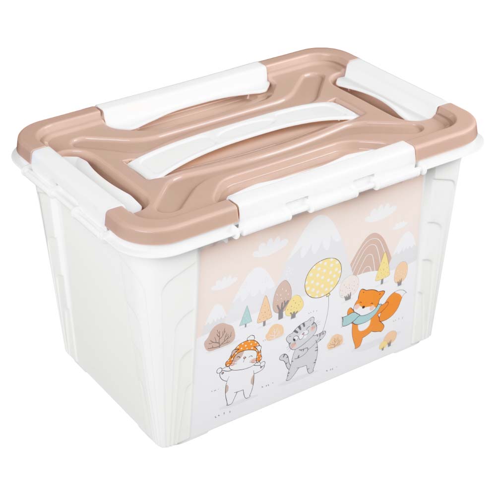 Особая крышка может открываться откидным способом, а может сниматься полностью. Крышка плотно фиксируется с помощью четырех замков по периметру. Благодаря удобной прочной ручке коробку можно переносить с места на место. Специальная выемка на крышке позволяет спрятать ручку для штабелирования коробок. Декор нанесен с помощью технологии IML: он не стирается и не повреждается в процессе использования. Ящик изготовлен из безопасного полипропилена, не имеет острых углов.